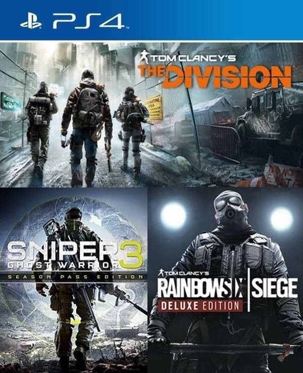 3 juegos en 1 TOM CLANCYS THE DIVISION MAS Sniper Ghost Warrior 3 Season Pass Edition MAS Tom Clancys Rainbow Six Siege Deluxe Edition PS4